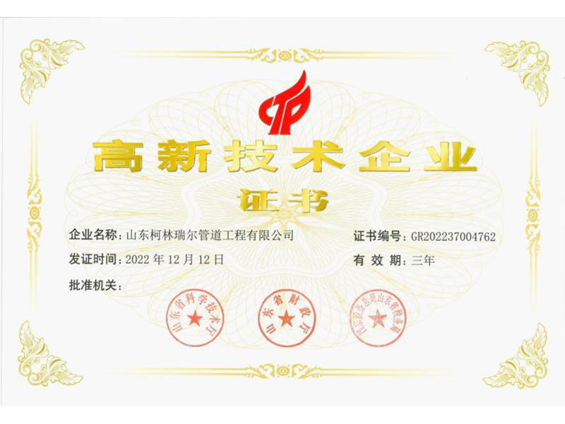山東柯林瑞爾管道工程有限公司是國(guó)家級(jí)高新技術(shù)企業(yè),水資源節(jié)約與保護(hù)產(chǎn)業(yè)創(chuàng)新聯(lián)盟理事單位。公司與中國(guó)石油大學(xué)(華東)、北京化工大學(xué)等多家知名院校和國(guó)家實(shí)驗(yàn)室建立了長(zhǎng)期密切的合作關(guān)系。公司被評(píng)為“山東省專利明星企業(yè)”,“質(zhì)量信得過(guò)單位”,“企業(yè)信用AAA級(jí)單位”,山東省“專精特新”企業(yè)。